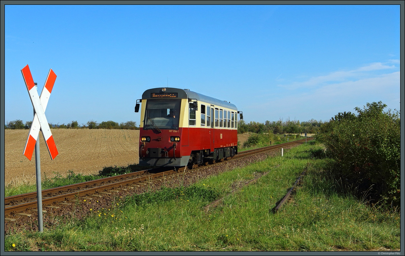 Am 05.10.2024 stand 187 018 der Harzer Schmalspurbahnen abfahrbereit auf dem Nordhäuser Bahnhofsplatz. In wenigen Minuten fährt der Triebwagen als Zug 8972 nach Eisfelder Talmühle. Michael Brunsch