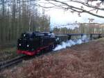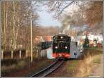 Lok 99 4801 mit Wagen der DR verlässt den Bahnhof Sellin Ost. Der DR-Traditionszug kam am „Neubaulok Wochenende“ unter anderem auf der Strecke zum Einsatz. - 19.10.2025