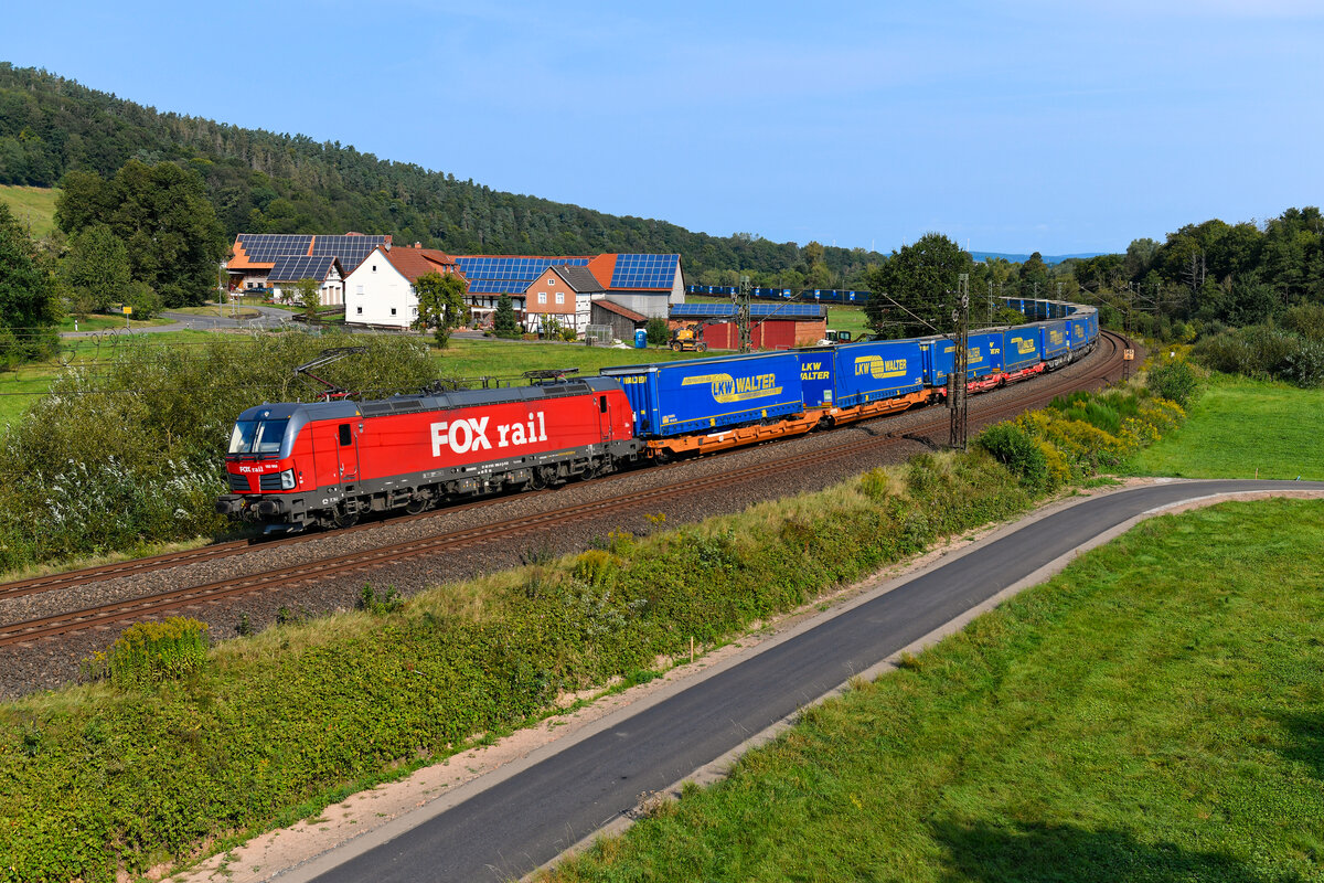 Bei besten Lichtverhältnissen konnte ich am 31. August 2024 die 193 966 des ungarischen Unternehmens FOXrail mit ihrem einheitlich mit Aufliegern der Spedition LKW Walter beladenen KLV-Zug DGS 40657 von Herne nach Oradea bei der Durchfahrt im osthessischen Hermannspiegel aufnehmen.