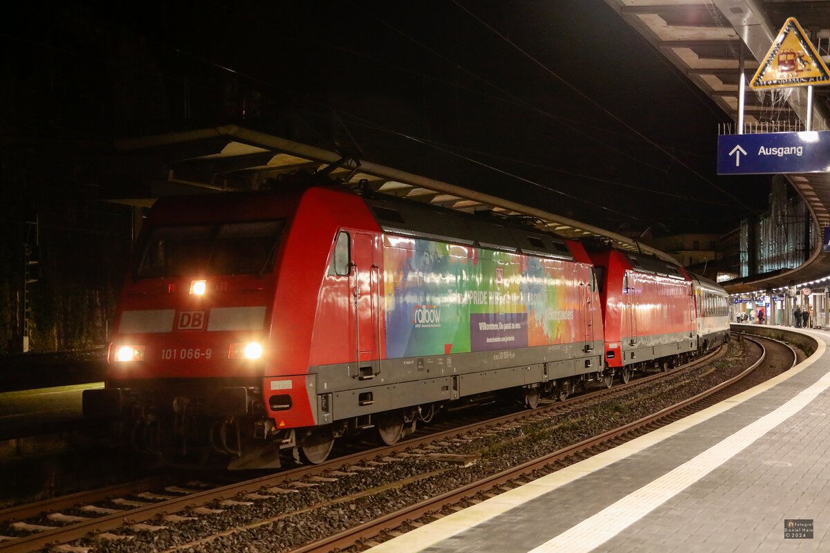 DB 101 066-9 "Einziganders" mit EC6 in Wuppertal Hbf, Dezember 2024.