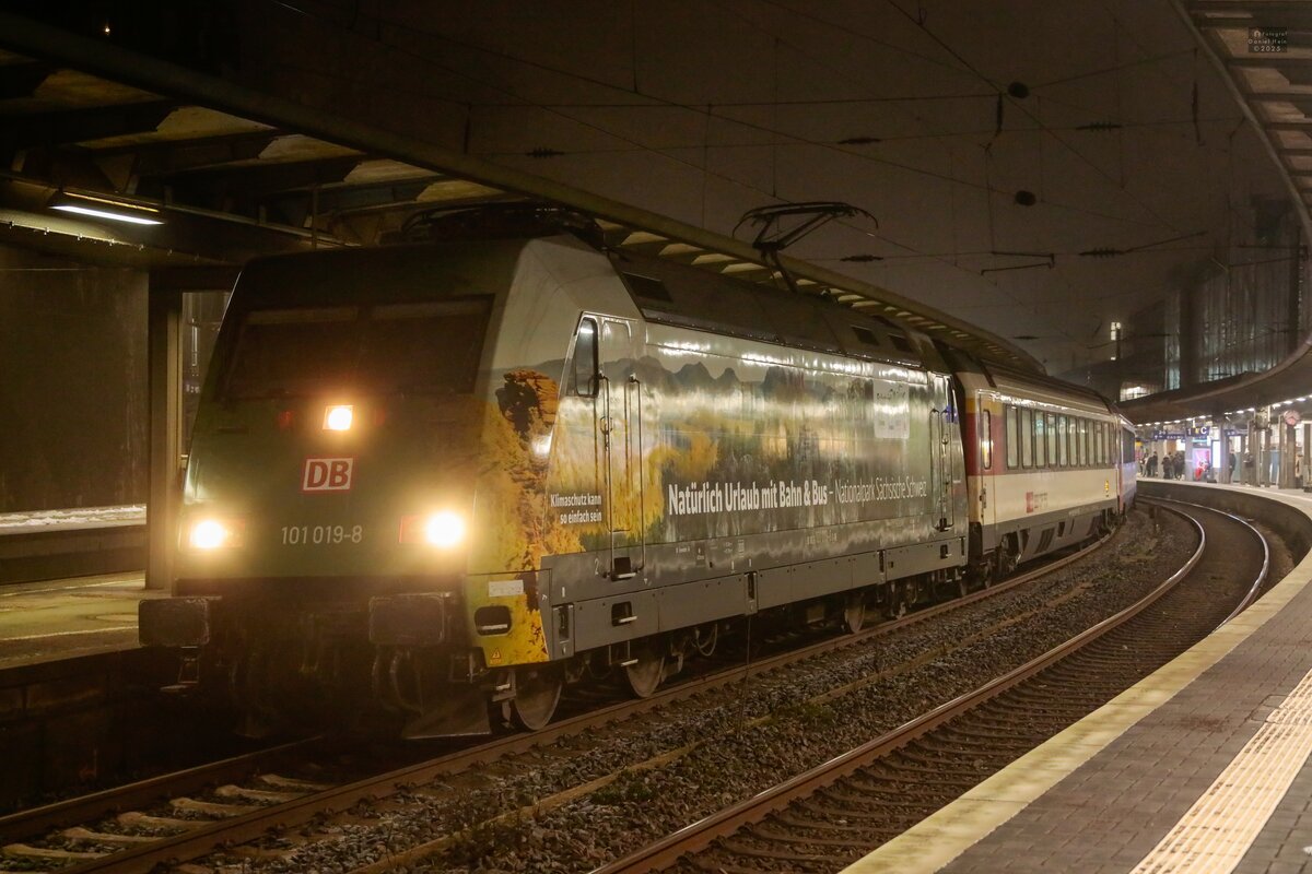 DB 101 019-8  Fahrtziel Natur  mit EC6 in Wuppertal Hbf, Januar 2025.