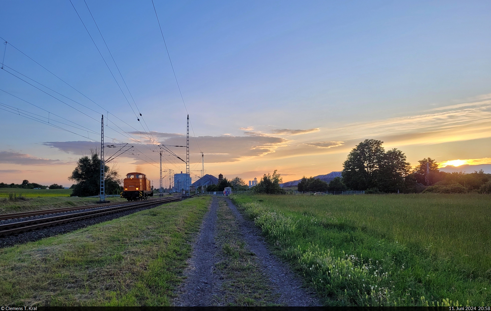 Als die untergehende Sonne hinter den Wolken verschwindet, tuckert 345 137-4 (105 137-4 | DR V 60 D) bei Teutschenthal zurück gen Halle (Saale).