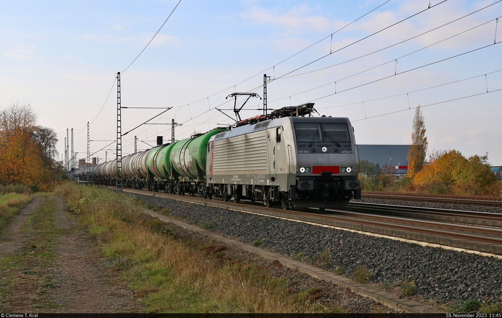 Kesselzug mit 189 843-6 (Siemens ES64F4-843) unterwegs in Landsberg (Saalekreis) Richtung Bitterfeld.