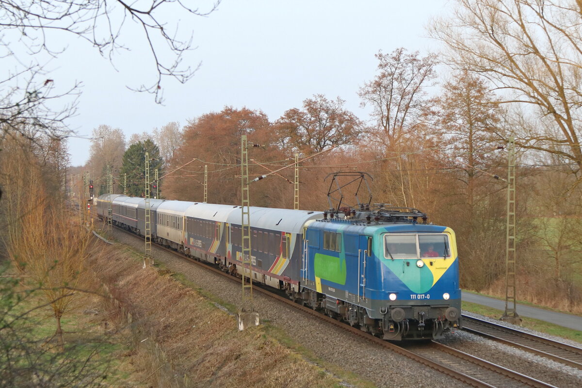 E10 1239 bespannte an Altweiber 2026, den 12.2.26, einen Sonderzug aus Münster zur Fahrt nach Willingen im Sauerland. Hier ist der Zug grade auf dem Weg durch Sythen. Jens Hubers