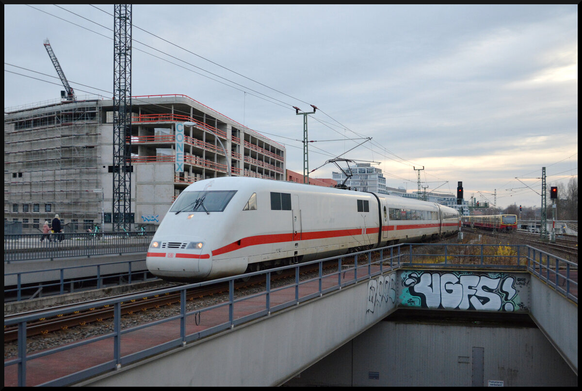 Zwei IC2 mit dem führenden 402 021 sind Ende November 2025 mit einem ICE in Berlin Ostbahnhof eingefahren und warten auf die Fahrt zur Abstellanlage Rummelsburg