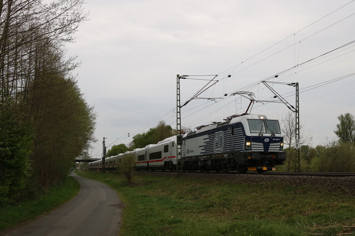 401 057 mit dem Taufnamen "Landshut" auf dem Weg von der Rheinmetropole Köln in die Hansestadt Hamburg bei der Durchfahrt in Sythen. Er ist einer von bislang zwei auf 9 Mittelwagen verkürzten ICE1 Triebzügen im Fernverkehr der Deutschen Bahn