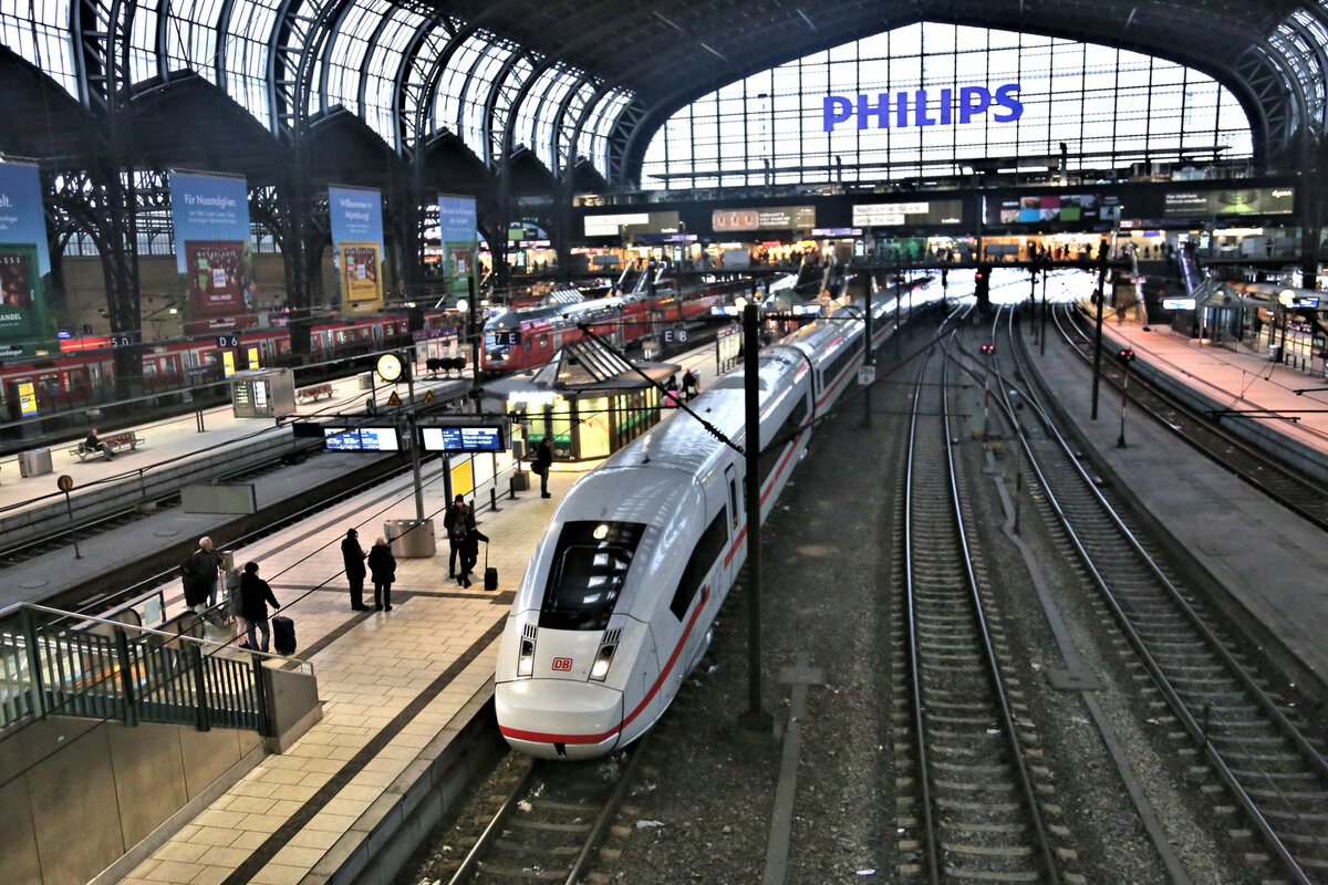 Langsam schlängelt sich der ICE 4 über Gleisbögen und Weichen hinaus aufs schneebedeckte Vorfeld des Hauptbahnhofes. Im Hintergrund ist die Hackerbrücke erkennbar.