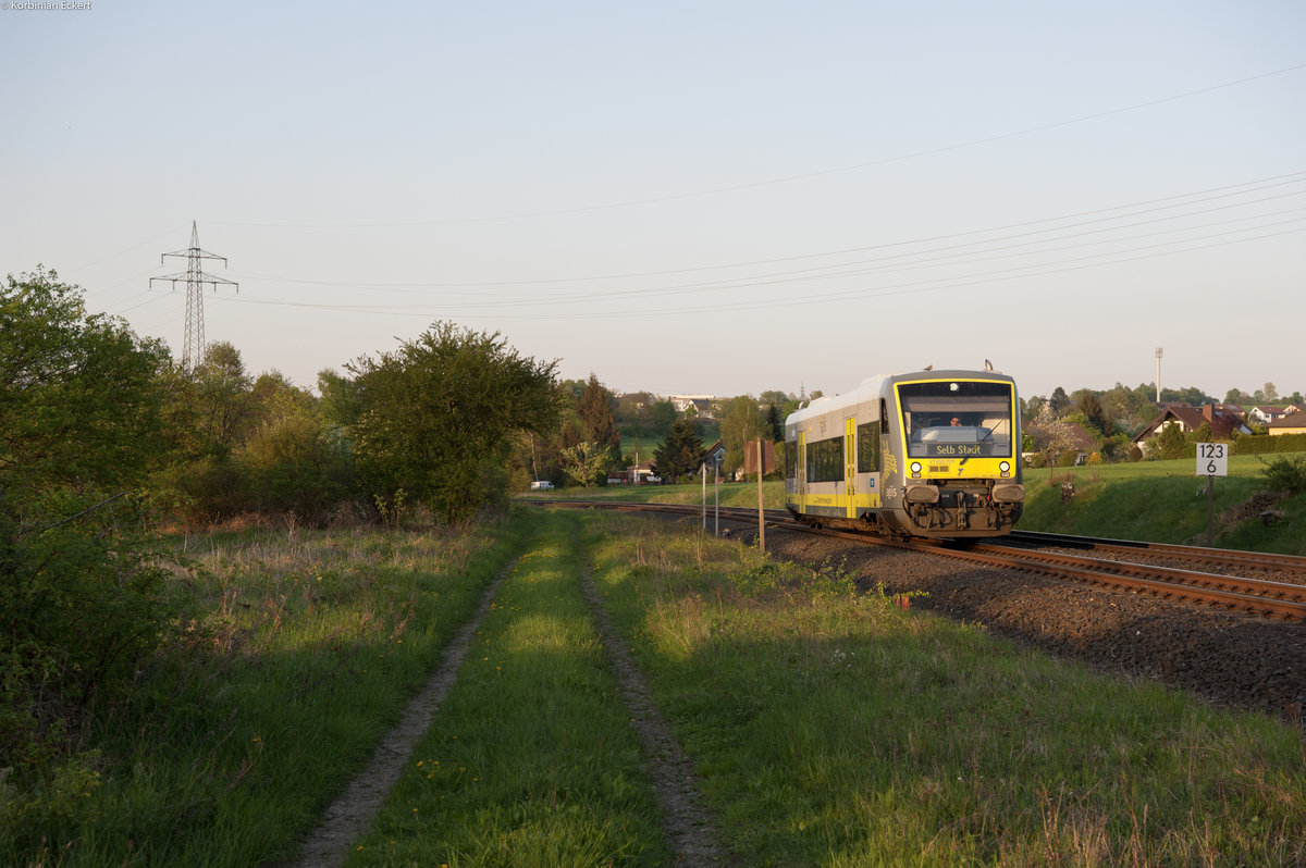 Am 20.12.2012 war dieser Werbe-Desiro der VBG auf der Strecke Hof - Selb Stadt im Einsatz. Hier gab es damals noch die Telegrafenleitung und Formsignale in Rehau. Auf dem Foto hat der Zug Rehau hinter sich, man sieht das Einfahrvorsignal und links ein Postenhaus, auch ein Kirchturm lugt raus. Heute ist die alte Technik weg...
