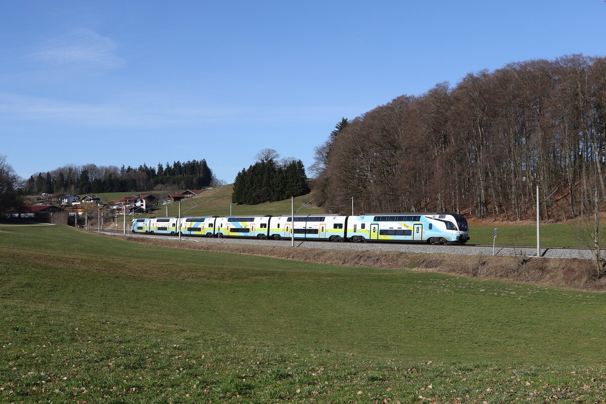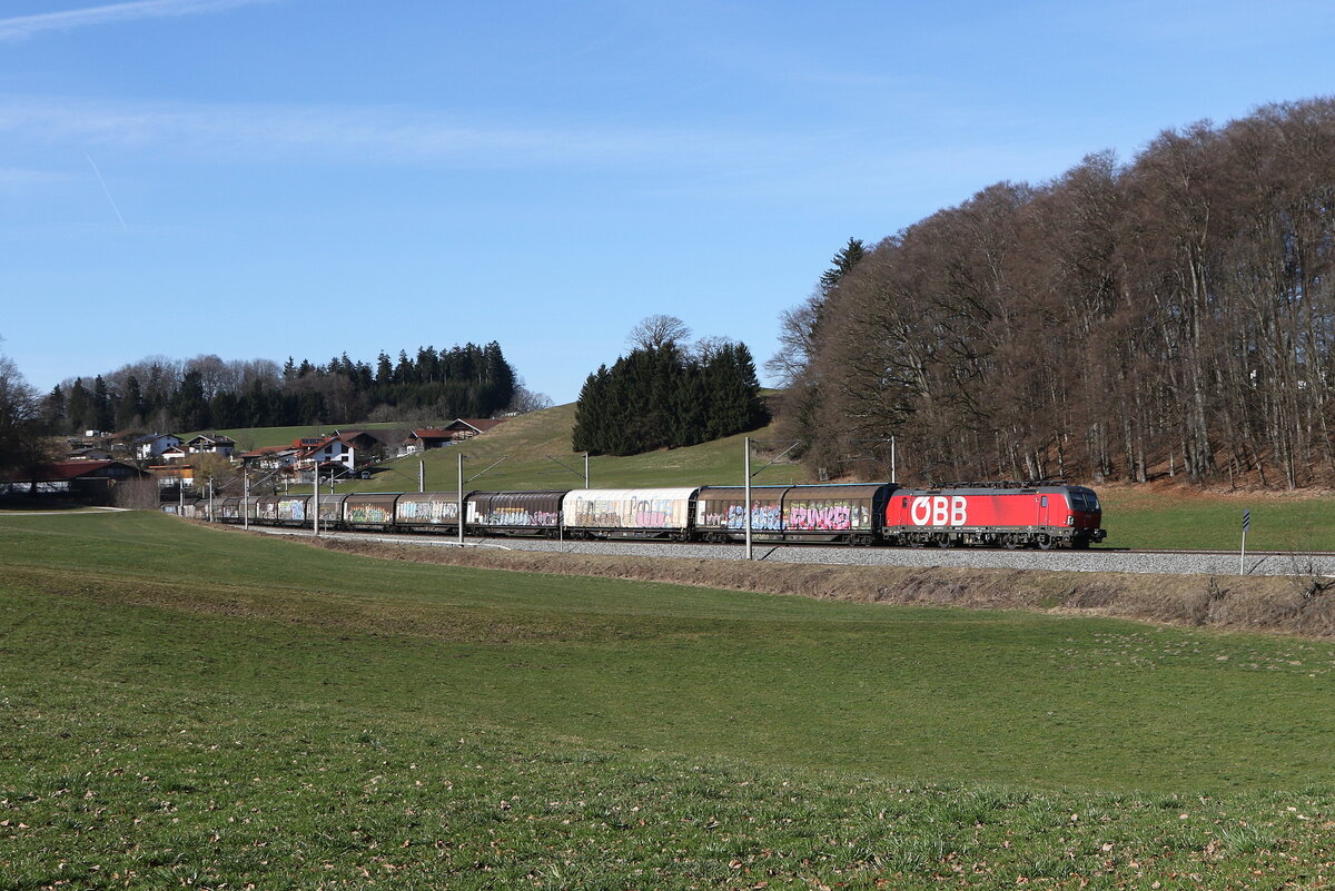 Bei Bergen im Chiemgau ergibt sich dieser schöne Ortsblick. Dort konnte ich am Abend des 23. Juli 2019 den von der Passauerbahn umgeleiteten DGS 40678 von Curtici nach Darmstadt Gbf aufnehmen. Es führte die von der Rurtalbahn Cargo angemietete 185 680, die mit ihrer Seitenwerbung für ein Studium der Schienenfahrzeugtechnik an der FH Aachen wirbt.