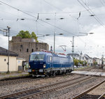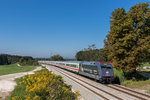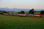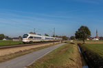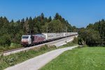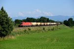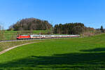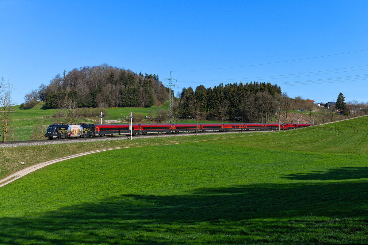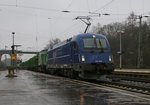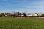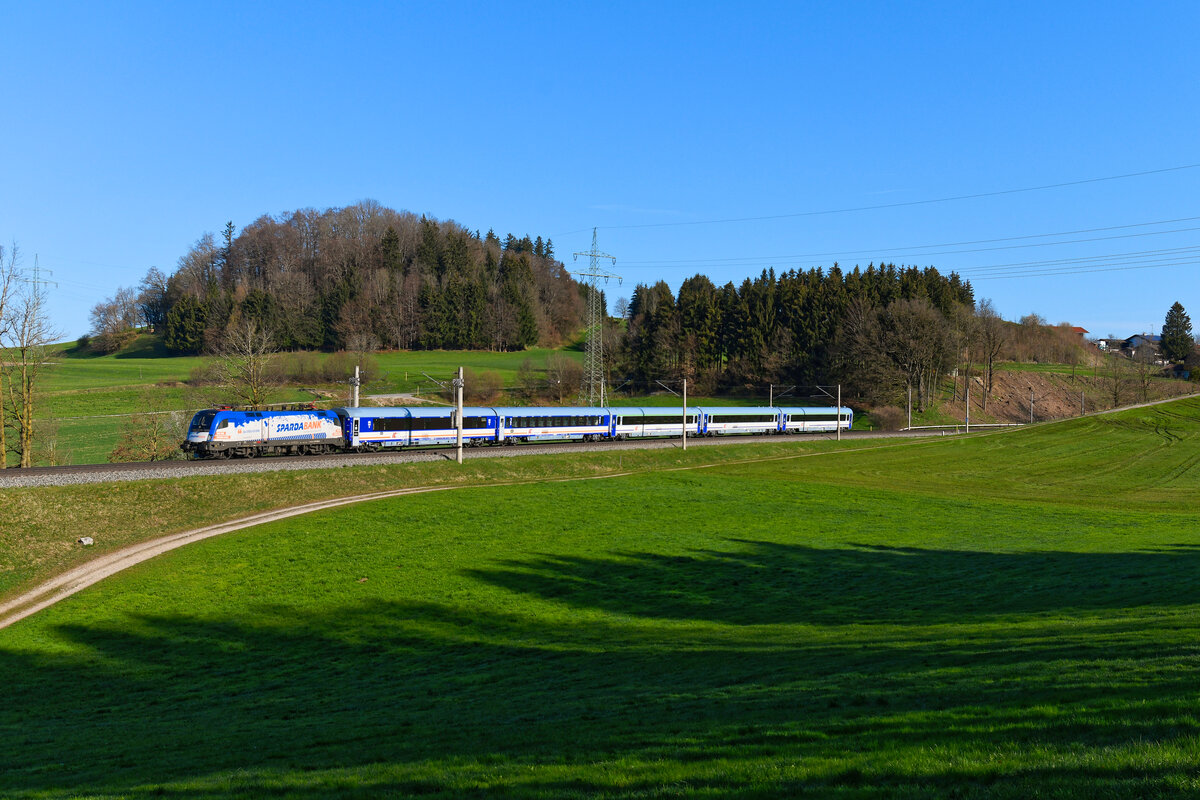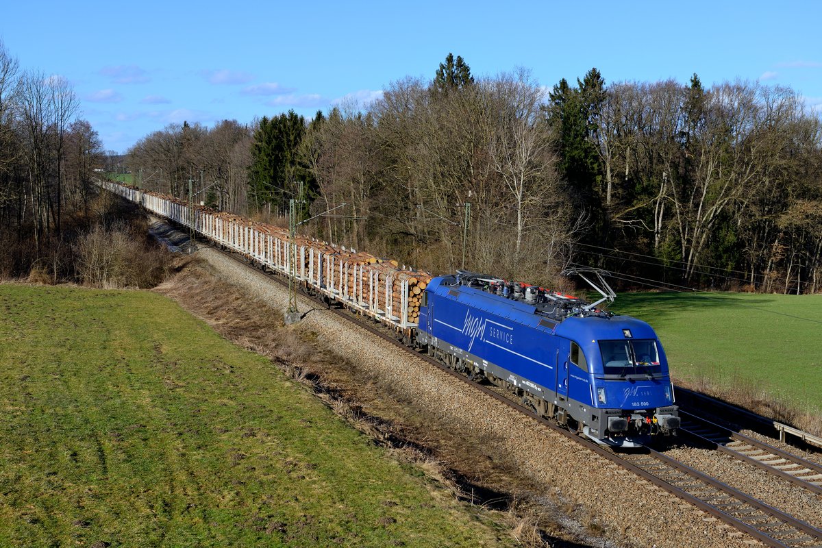 Zur Planzeit des Meridian tauchte auch pünktlich etwas blaues am Horizont auf und näherte sich in langsamer Fahrt der Straßenbrücke bei Gutmart. Glücklicherweise fiel uns gerade noch rechtzeitig auf, dass es sich dabei nicht um einen FLIRT-Triebwagen handelte, sondern um die MGW 183 500 mit einem Holzzug in Richtung Österreich (03. März 2015).
