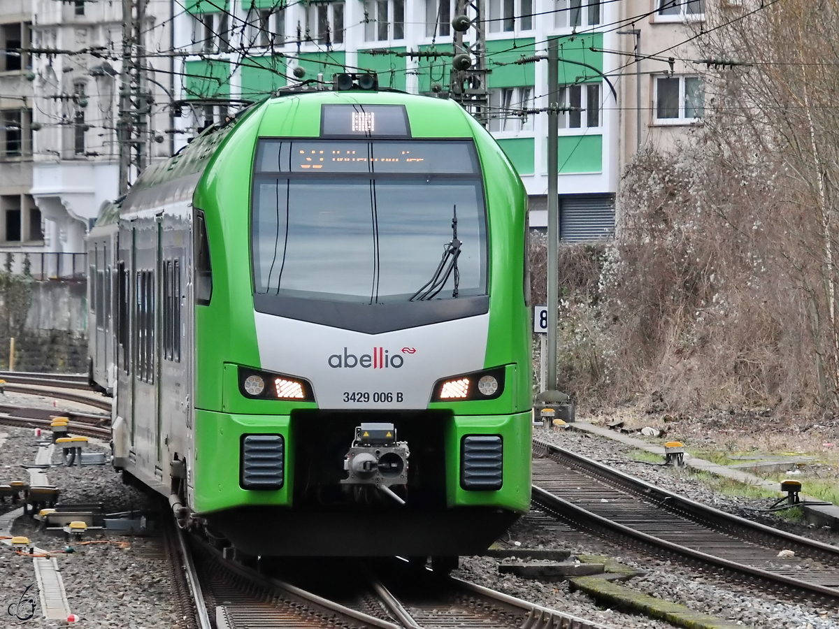 Der Elektrotriebzug 3429 006 bei der Ankunft am Hauptbahnhof Wuppertal. (Februar 2021)
