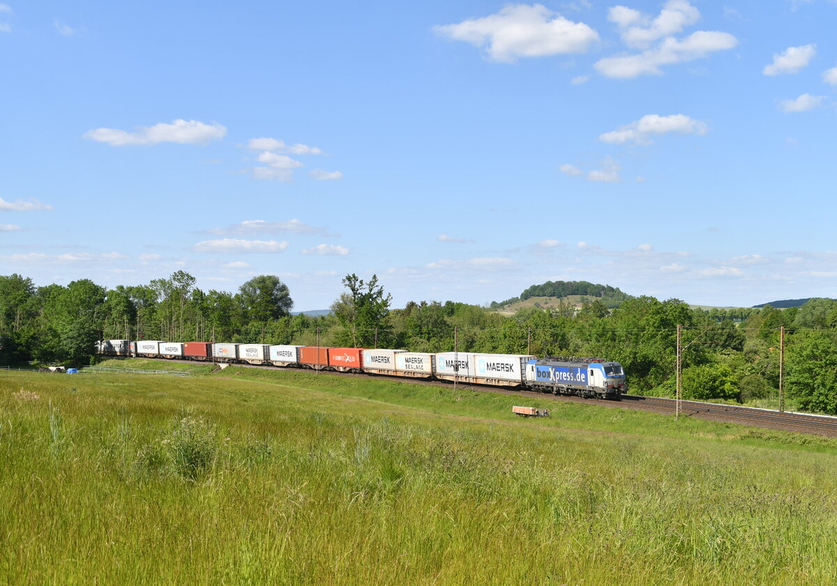 193 834 mit einem Containerzug am 28.05.2020 bei Friedland(Han)