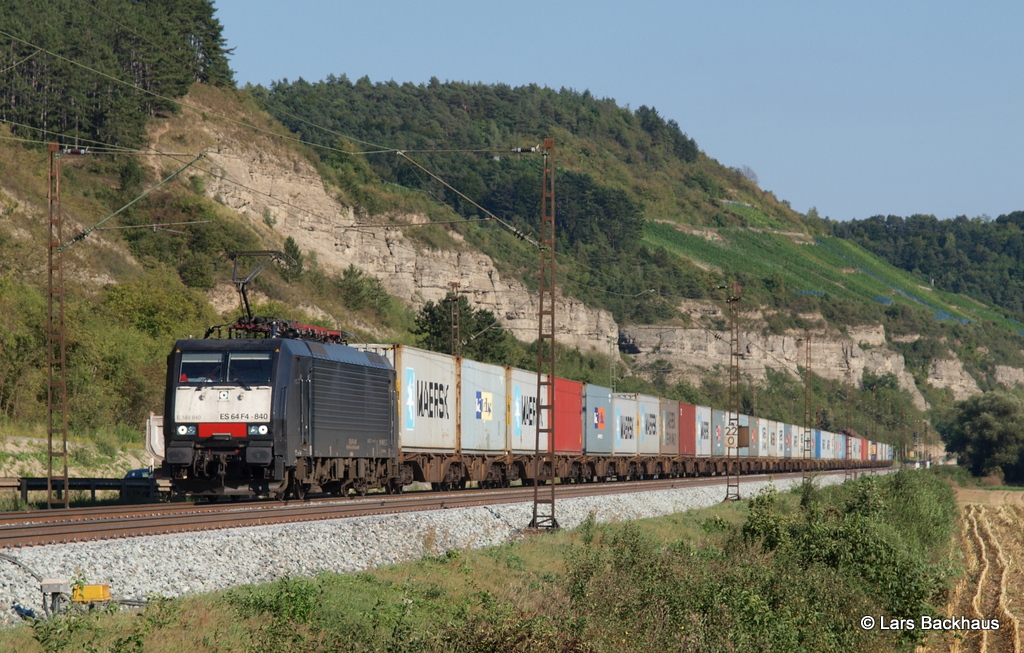 Mit einem langen Containerzug am Haken passiert ES 64 F4-840 boxXpress die Sandsteinfelsen vor Karlstadt (Main) am 4.09.12.