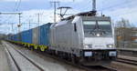 186 275-4 fährt über die Gütergleise durch oelde in Richtung Bielefeld. Links sieht man den Notbahnsteig Gleis 1. Oelde 10.04.2025