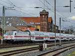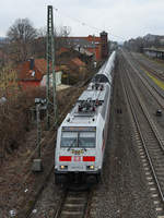 Ein von der Elektrolokomotive 146 567-3 geschobener IC2 ist hier im März 2021 bei der Durchfahrt in Wuppertal-Unterbarmen zu sehen.