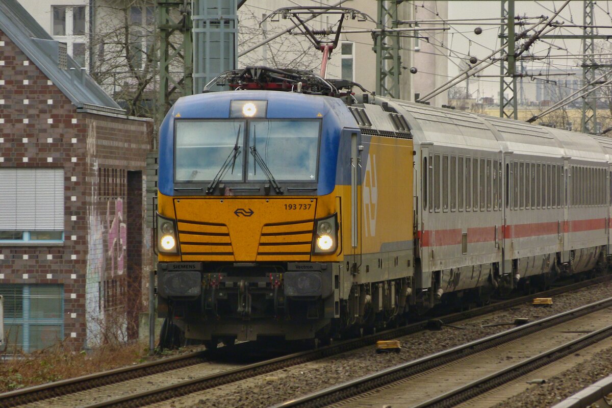 193 737 der ELL, im Auftrag der DB und NS zieht am 03.03.2024 seinen InterCity-1 Flachpark auf der Linie 77 durch den Haltepunkt Berlin-Savignyplatz.