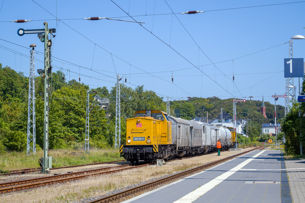 Spritzzug mit zwei Lok’s der BR 203 haben den Endbahnhof Sassnitz erreicht, nach dem Fahrtrichtungswechsel geht die Fahrt zurück bis Lietzow .Von dort wird die „Spritztour“ bis Binz fortgesetzt. - 18.07.2019