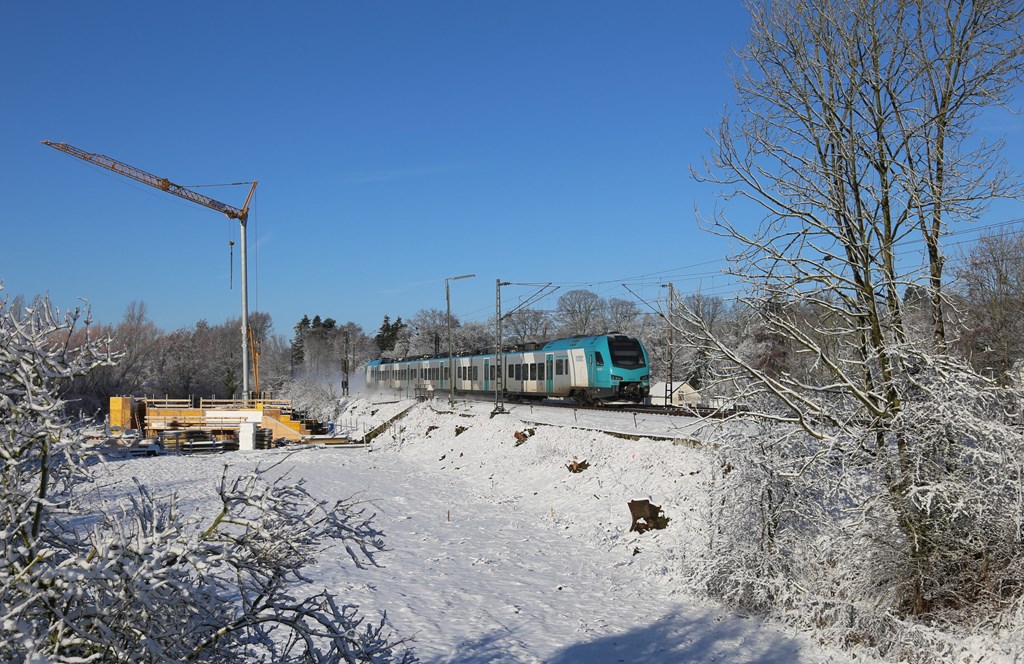 In alter Westfalen Bahn Lackierung ist noch immer die Eurobahn zwischen Osnabrück und Münster im Pendelzugverkehr im Einsatz. Am 7.2.2023 ist hier der ERB 9.03 um 11.35 Uhr kurz vor dem Halte in Natrup-Hagen zu sehen.
