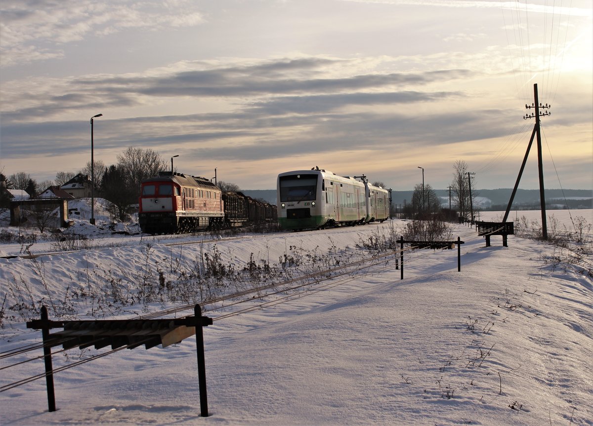 232 283-2 (WFL) stand am 16.02.21 wieder mit einen Holzzug in Triptis.