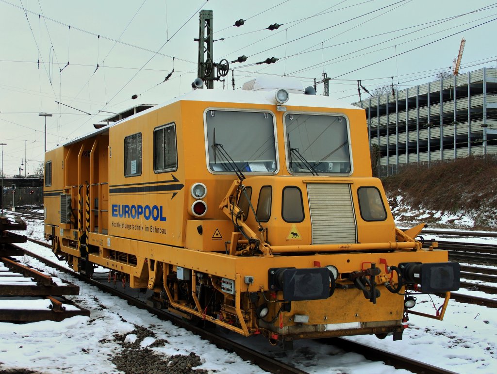 Gleisvormessmaschine EM-SAT 120 von Europool am 16.03.2013 in Aachen West. Gut zu sehen ist der selbstfahrende Satellit mit der Lasersendeeinheit.