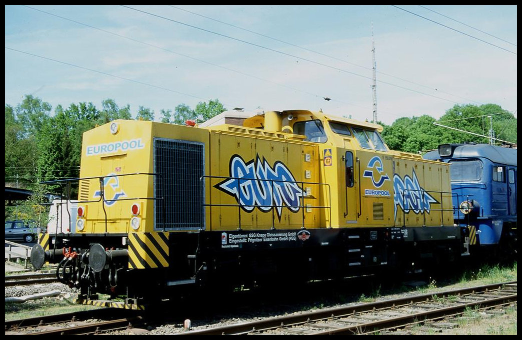 Betriebsruhe am 13.5.2001 für Euro Pool V 100 der Fa. Knape im Bahnhof Stolberg.