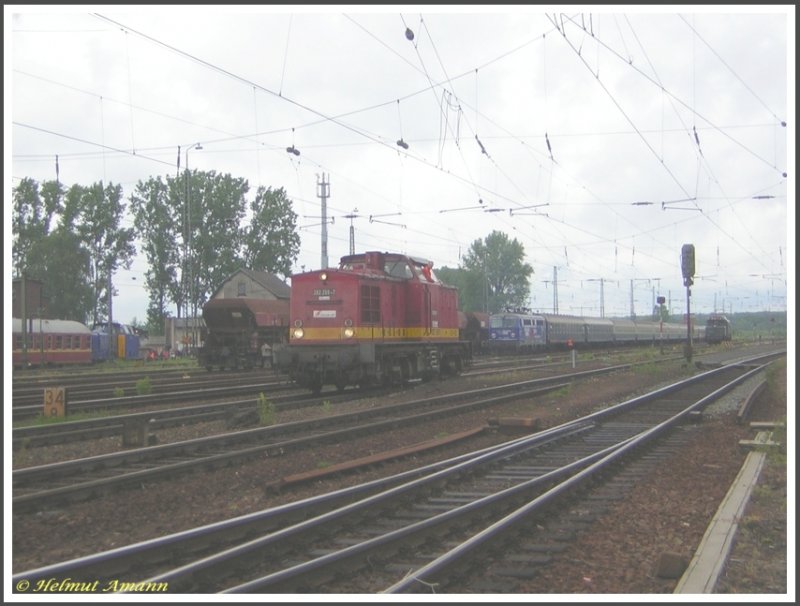 Ex-DR 202 269, jetzt im Besitz der Firma Gleiskraft GmbH, rangierte am 17.05.2007 gegenüber dem Eisenbahnmuseum Darmstadt-Kranichstein. Am Bildrand links die V 62 der Darmstädter Kreiseisenbahn, hinter der 202 die 1042 520 des Eisenbahn Kurier und im Bildhintergund ist 194 051 zu sehen. Helmut Amann