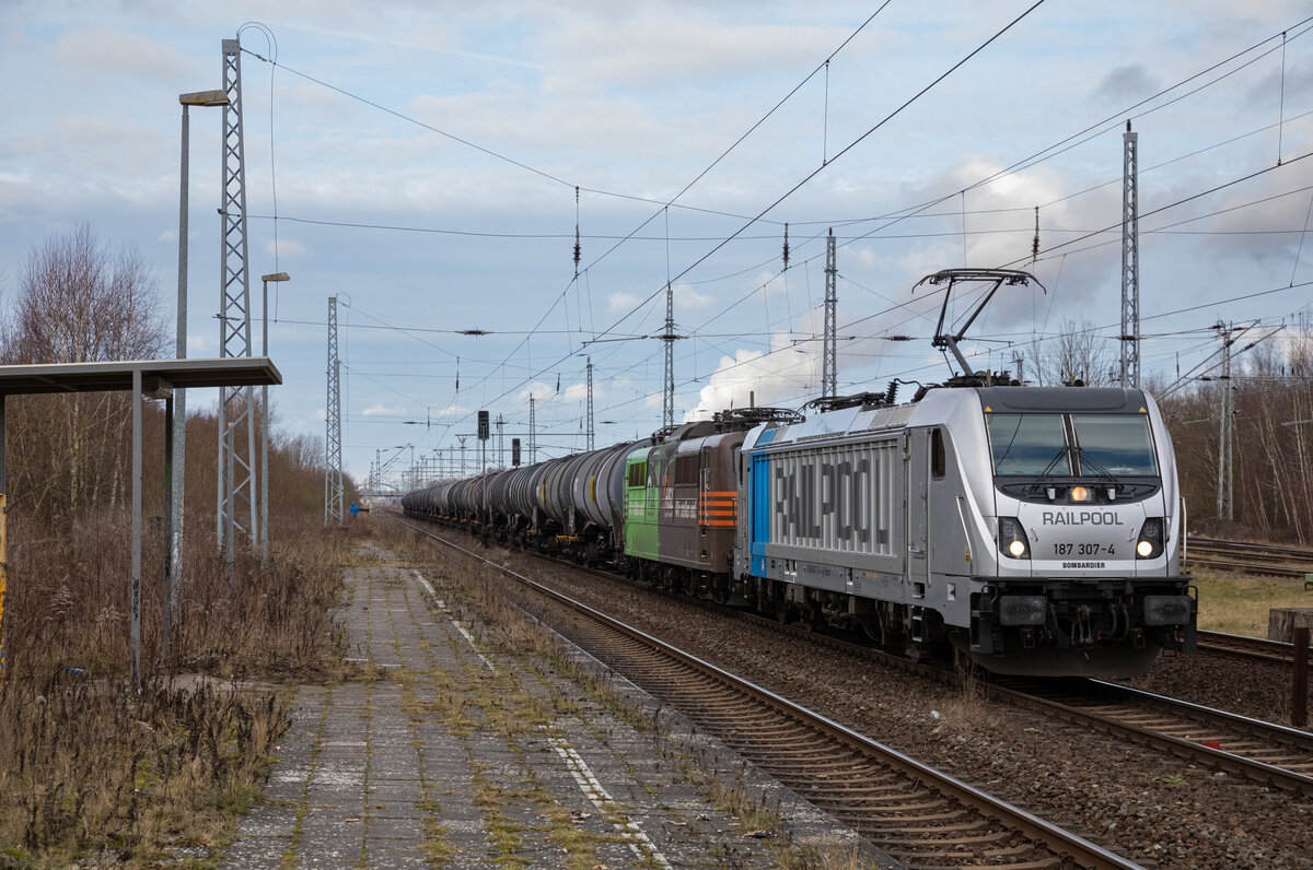 HSL Kesselzug mit Railpool 187 307 & 151 138 am 28.01.2023 in Rostock Seehafen Süd.