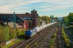 185 350 RheinCargo "Grenzenlos für Sie im Einsatz" mit einem Kesselzug bei Harrbach Richtung Würzburg, 07.10.2021