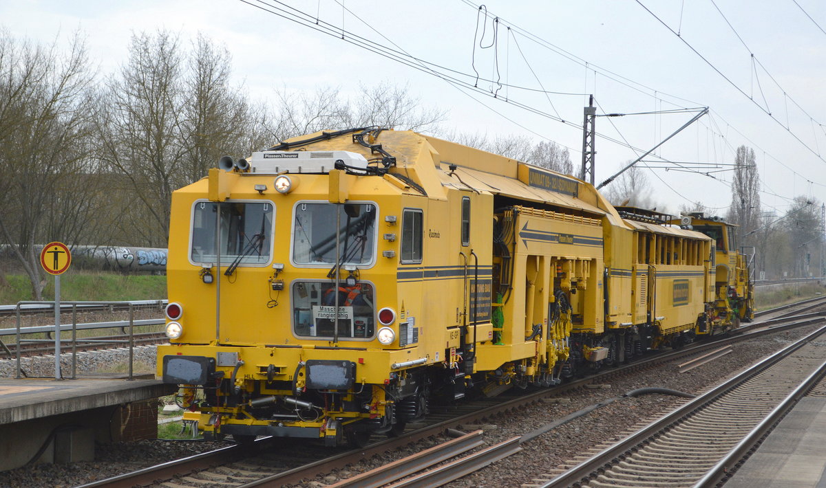 HARTUNG BAU, Ingenieur- Tief- und Straßenbau GmbH mit einer P&T Gleisstopfmaschine vom Typ UNIMAT 09-32/4S DYNAMIC, Name: "Quasimodo" + Schotterplaniermaschine vom TYP P&T SSP 110SW am 01.04.21 Durchfahrt Bf. Berlin-Hohenschönhausen.