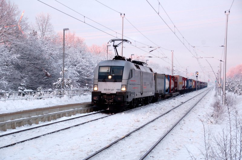 ES 64 U2 - 100 der HUPAC durchfährt am 09.01.09 mit einem Güterzug den bahnhof Burgkemnitz in Richtung Halle(bestätigte Sichtung). Da ich den selben Zug schon zwei Tage vorher fotografieren konnte, wird es wohl eine Planleistung sein.