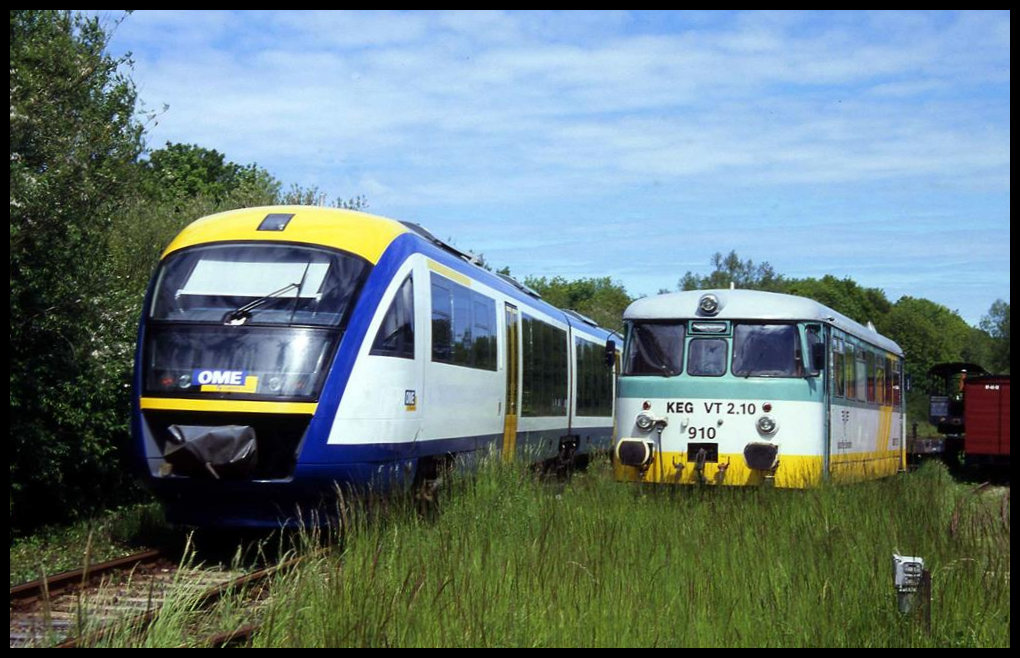 Ein OME Desiro verläßt hier am 29.5.2004 Putbus in Richtung Bergen und passiert dabei den MAN Triebwagen der KEG, der zu diesem Zeitpunkt noch als Reservefahrzeug vorgehalten wurde.