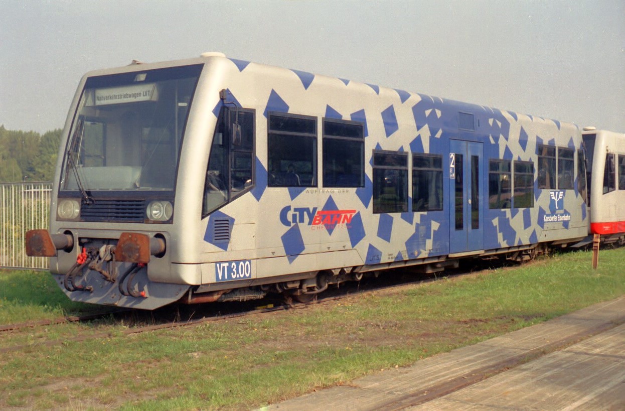 Foto eines LVT/S der CityBahn Chemnitz mit Bezeichnung VT 3.00 auf dem Freigelände im Waggonbau Bautzen, fotografiert im Jahr 2003, fotografiert durch den Betriebszaun, vom Spreeradweg aus.
