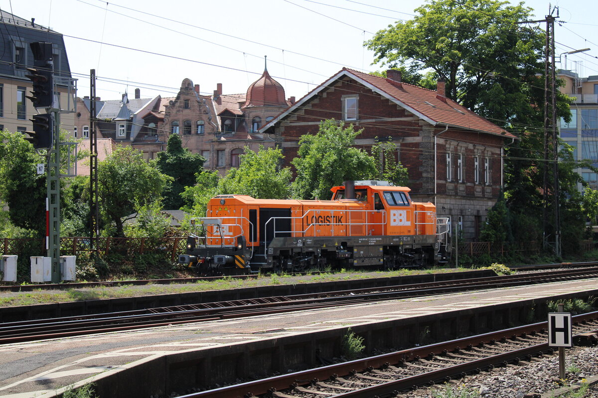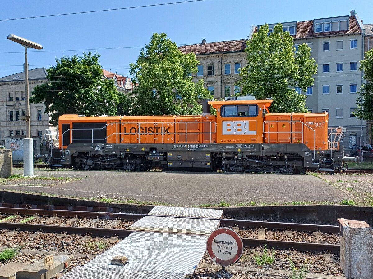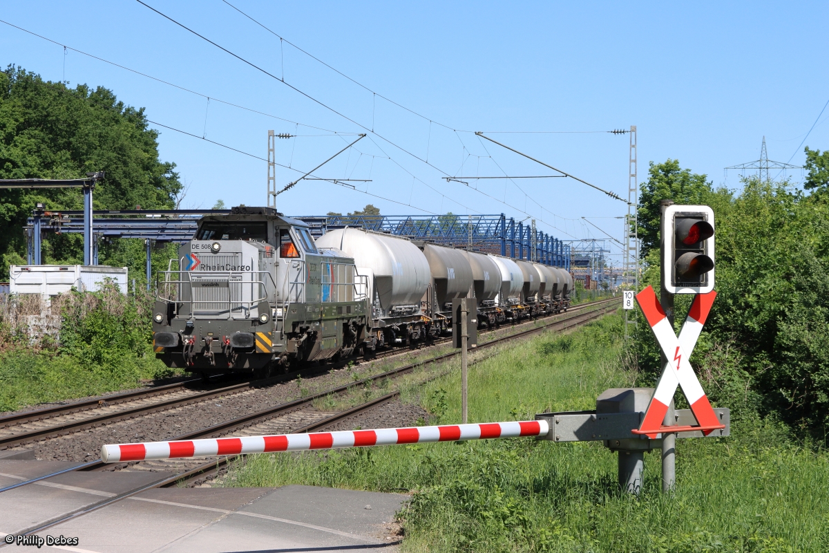 Die Diesellokomotive Locon 323 (4185 030-8) zog Anfang Mai 2021 einen Containerzug durch Duisburg-Wanheimerort.