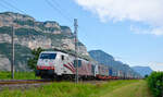 In einem Waldstück bei Reischenhart fotografierte ich am 15. Juni 2025 den KLV-Zug DGS 43129 auf der Fahrt nach Verona Q.E. mit 186 440 und einer weiteren 186 von Railpool als Zuglok.