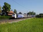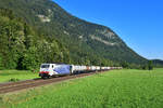 In einem Waldstück bei Reischenhart fotografierte ich am 15. Juni 2025 den KLV-Zug DGS 43129 auf der Fahrt nach Verona Q.E. mit 186 440 und einer weiteren 186 von Railpool als Zuglok.