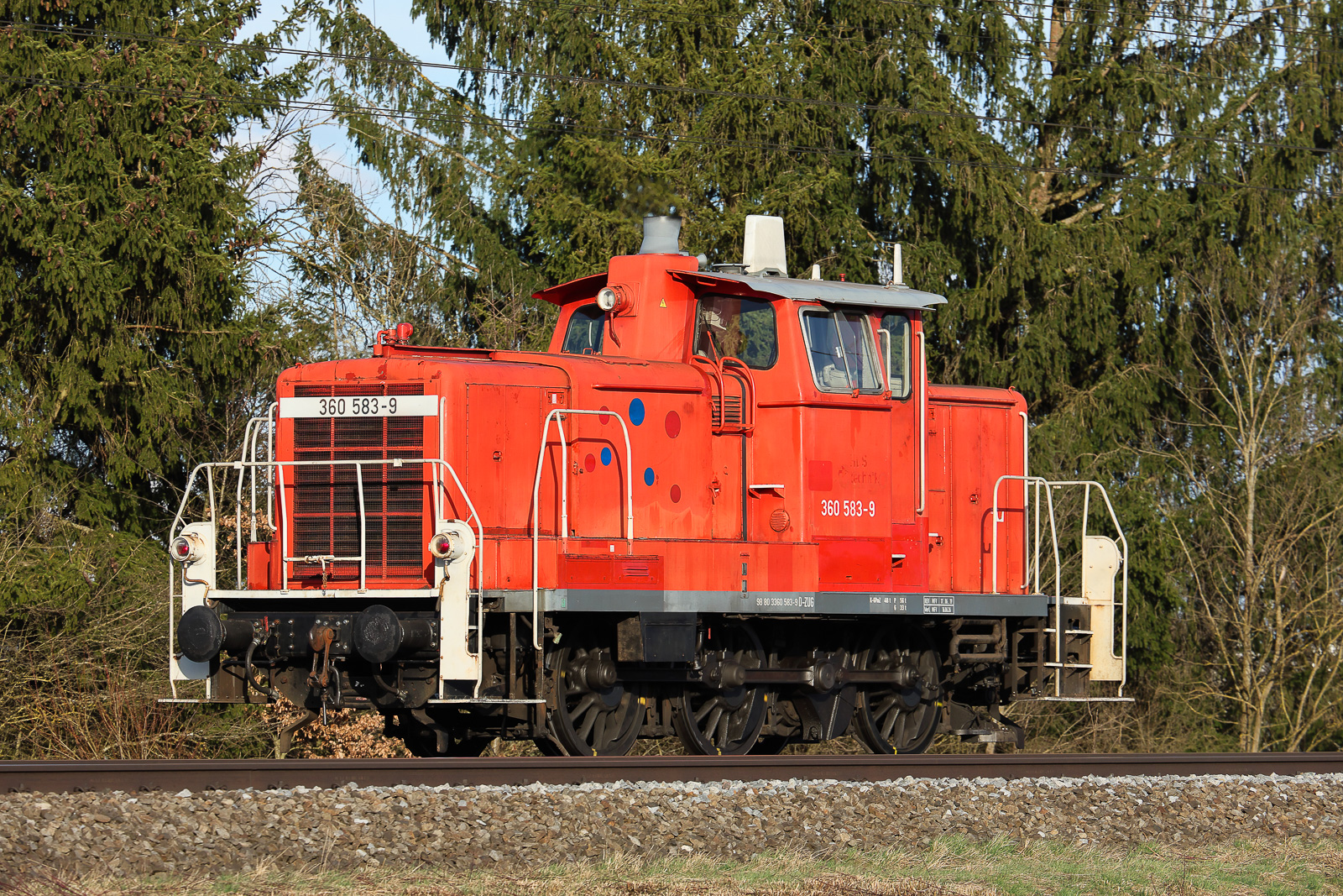Die Diesellokomotive 360 583-9 am 11.3.26 bei Zorneding auf dem S-Bahn  Gleis mit unbekannten Ziel Richtung Rosenheim. Und wem gehört sie aktuell, die Punkte sehen ja verdächtig nach smart rail aus ?