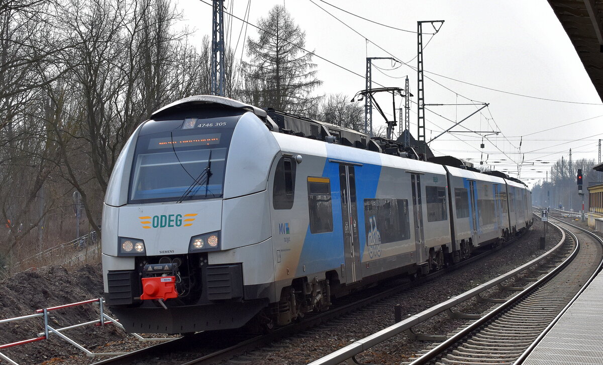 ODEG auf Dienstfahrt mit dem Desiro ML  4746 305  Richtung Nordosten, wahrscheinlich Eberswalde am 23.02.23 Berlin Buch.