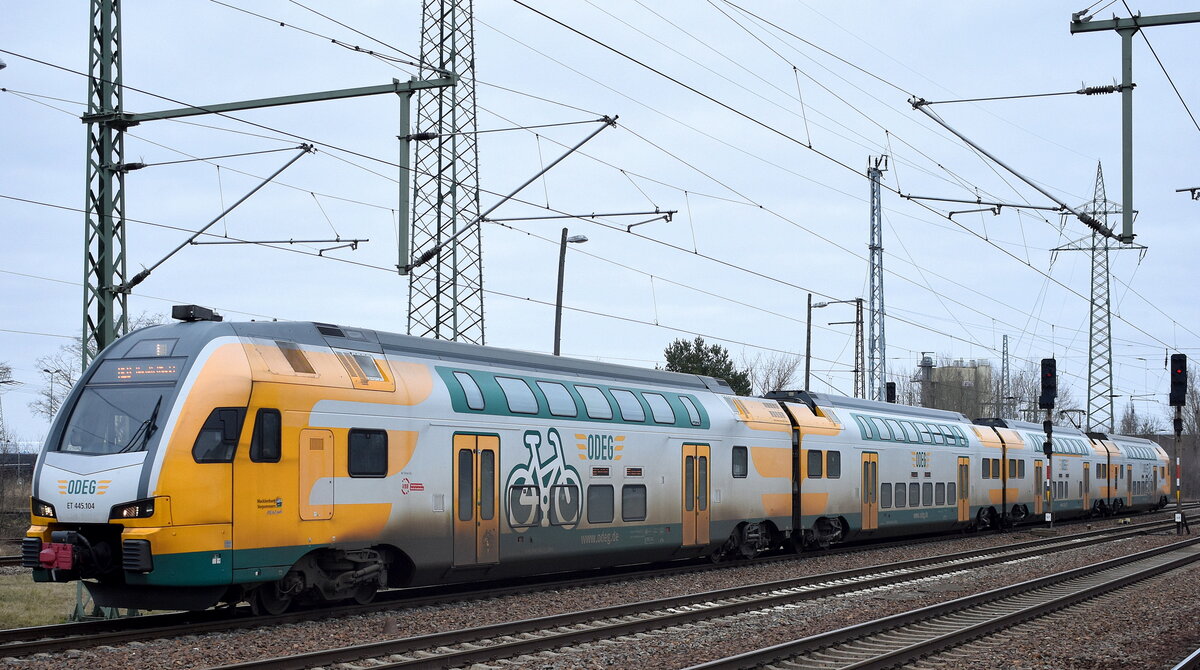 Baustellenbedingt hält der RE 8 im Moment im Bahnhof Flughafen BER Terminal 5, hier die ODEG mit "ET 445.104" bei der Einfahrt im Bahnhof Richtung Baruth(Mark) am 22.02.23