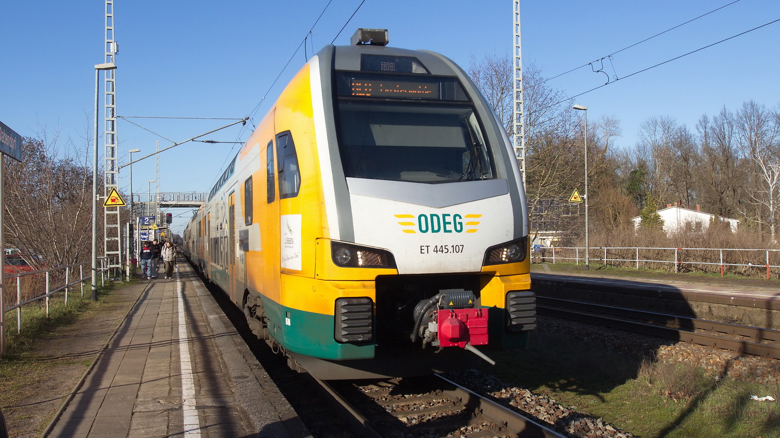 ET 445 107 der ODEG auf der Linie RE 8 N bei der Einfahrt in den Bahnhof Dabendorf (bei Zossen) zur Weiterfahrt nach Elsterwerder am 28. Februar 2023.