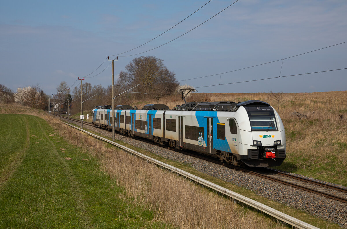 ODEG 4746 305 als RE9 Sassnitz - Lietzow am 16.04.2023 zwischen Borchtitz und Lietzow.
