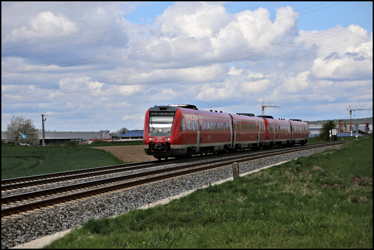 Auf der KBS 855 sind neben den wenigen mit der DB 218 Baureihe bespannten Dostos etliche Dieseltriebzüge der Reihe 612 im Einsatz. Am 20.4.2026 um 15.25 Uhr hat VT 612985-1 zusammen mit einem zweiten VT Fahrzeug Regenstauf verlassen und ist nun unterwegs zum Hauptbahnhof Regensburg. Gerd Hahn