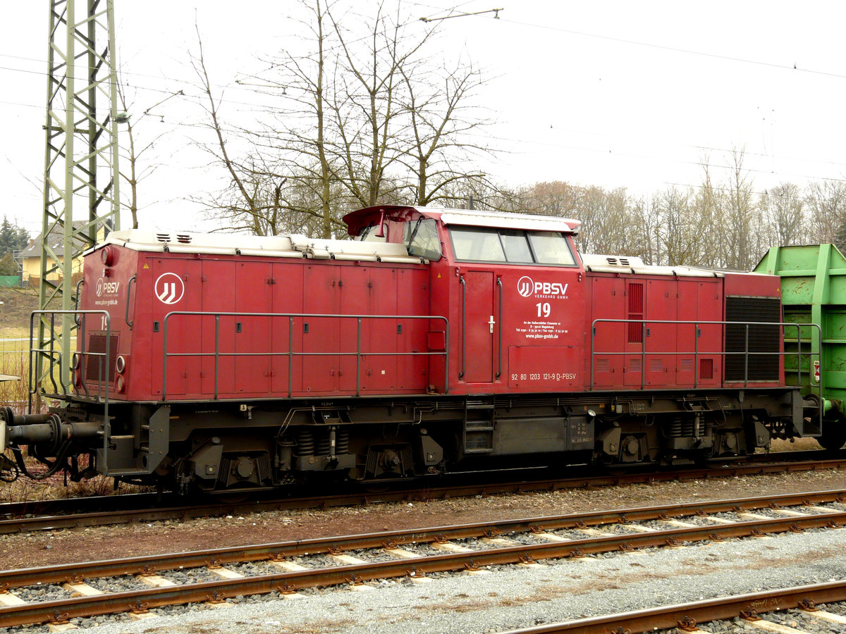 17. März 2010, Im Bahnhof Hochstadt-Marktzeuln steht Lok PBSV 19. Lokgeschichte: 1971   Auslieferung an DR als 110 324. 30.07.1980 Einbau 1200 PS Motor. 01.01.1981 Umzeichnung in 112 324. 01.01.1992  Umzeichnung in 202 324. 15.08.1998 Ausmusterung in Görlitz, an SFZ - Schienenfahrzeugzentrum Stendal. 01.11.2002 an ALS - ALSTOM Lokomotiven Service GmbH, Stendal. Umbau gemäß Umbaukonzept BR 203.1. 09.02.2007 an PBSV-Verkehrs-GmbH, Magdeburg  19 . (Quelle: v100-online.de)