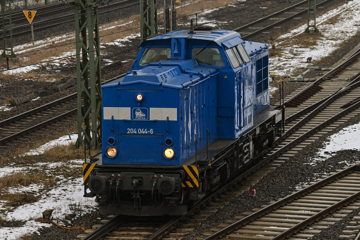 D-PRESS 202 811-6 (204 044-6) fuhr am 09.02.2026 nach dem Rangieren eines Holzzuges zum Lübecker Konstinkai/ Konstinbahnhof (ALKO). Hier bei der Ausfahrt aus dem Lübecker Hbgf (ALR).