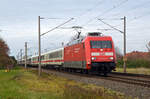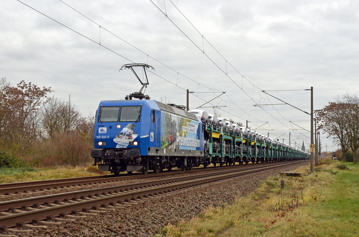 145 060 (145 103) der Press schleppte am 12.12.23 einen VW-Autozug durch Greppin Richtung Dessau.