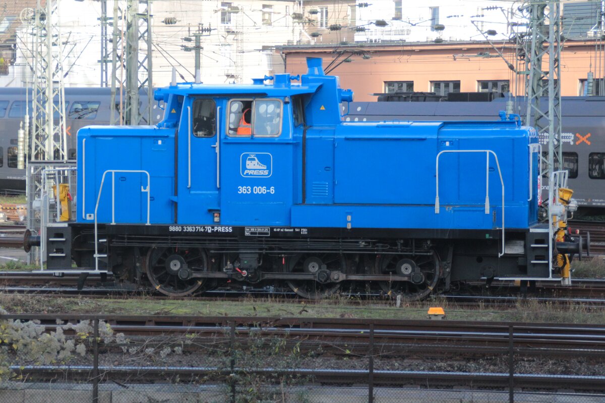 PRESS 363 006-6 (9880 3363 714-7D-PRESS) am 09.12.2025, 12:45 Uhr bei Rangierfahrt in Köln Bbf, etwa auf Höhe S-Bahnstation Hansaring.