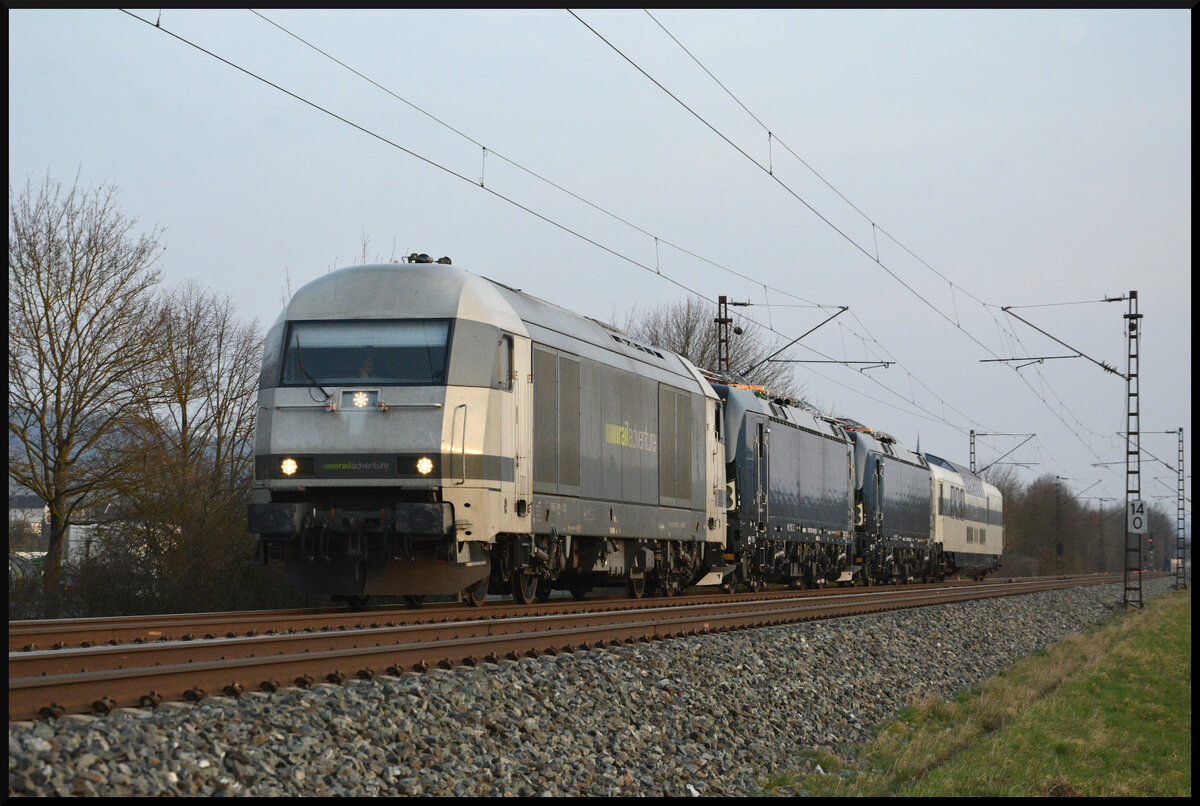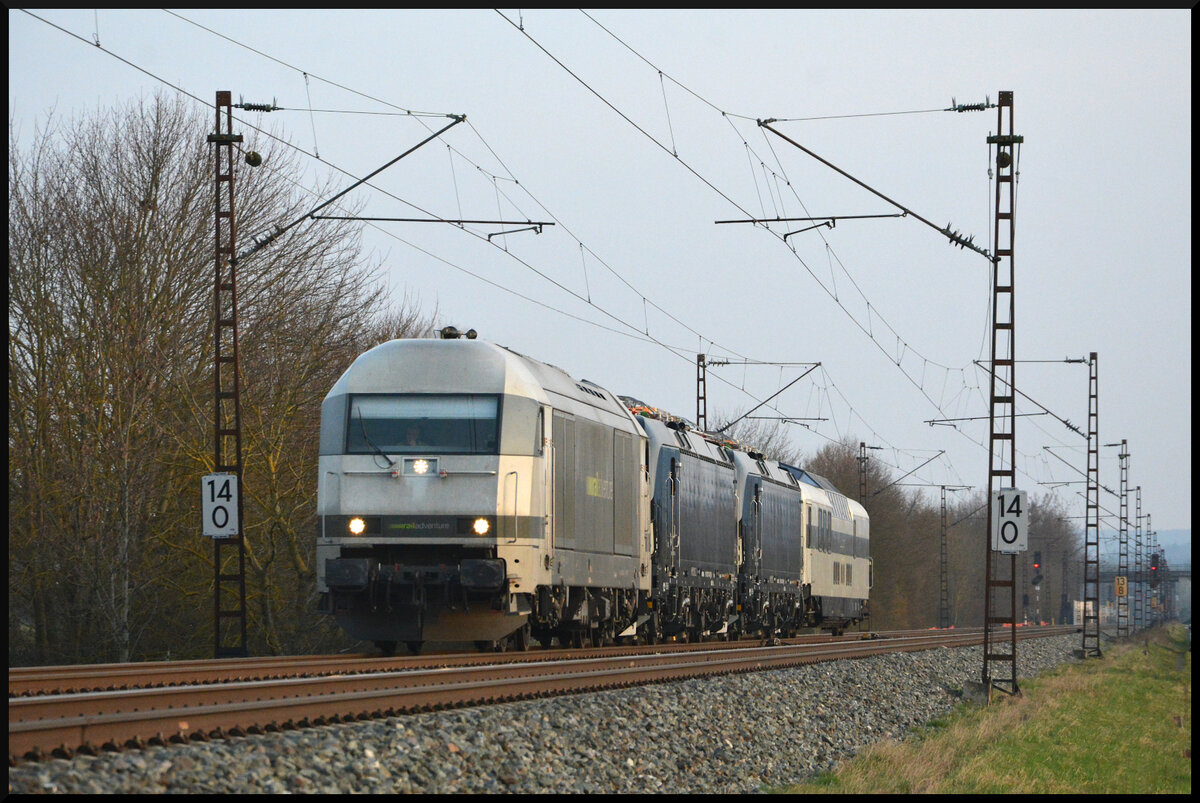 Der Railadventure "Waschbär" 2016 902 fuhr am 08.03.2026 mit zwei neuen Vectron (5370 174 PL-ID & 5370 180 PL-ID) sowie dem Aussichtswagen LUXON (CH-RADVE 61 85 8990 003-3 SRmz) im trüben Abendlicht durch Thüngersheim gen Norden. Matthias Kümmel