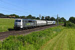 Im Altmühltal lassen sich gelegentlich Lokzüge aus dem Siemens Werk in München Allach nach Braunschweig beobachten. Am 07. September 2024 überführte die 111 029 von railadventure folgende Maschinen: Die 7193 801 im neuen Design von Beacon Rail, die 6193 184 von Railpool, die 475 433 für die BLS Cargo, sowie die 7193 301 für TXLogistik. Am Zugschluss hing noch die 218 447 von RP. Mit insgesamt sechs Maschinen wies der Lokzug ein passende Länge für das Motiv in Breitenfurt auf.