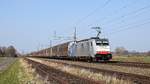 Railpool 186 450, vermietet an Lineas, mit Volvo-Logistikzug DGS 46257 Hallsberg RB - Gent Zeehaven (Diepholz, 24.03.2021).