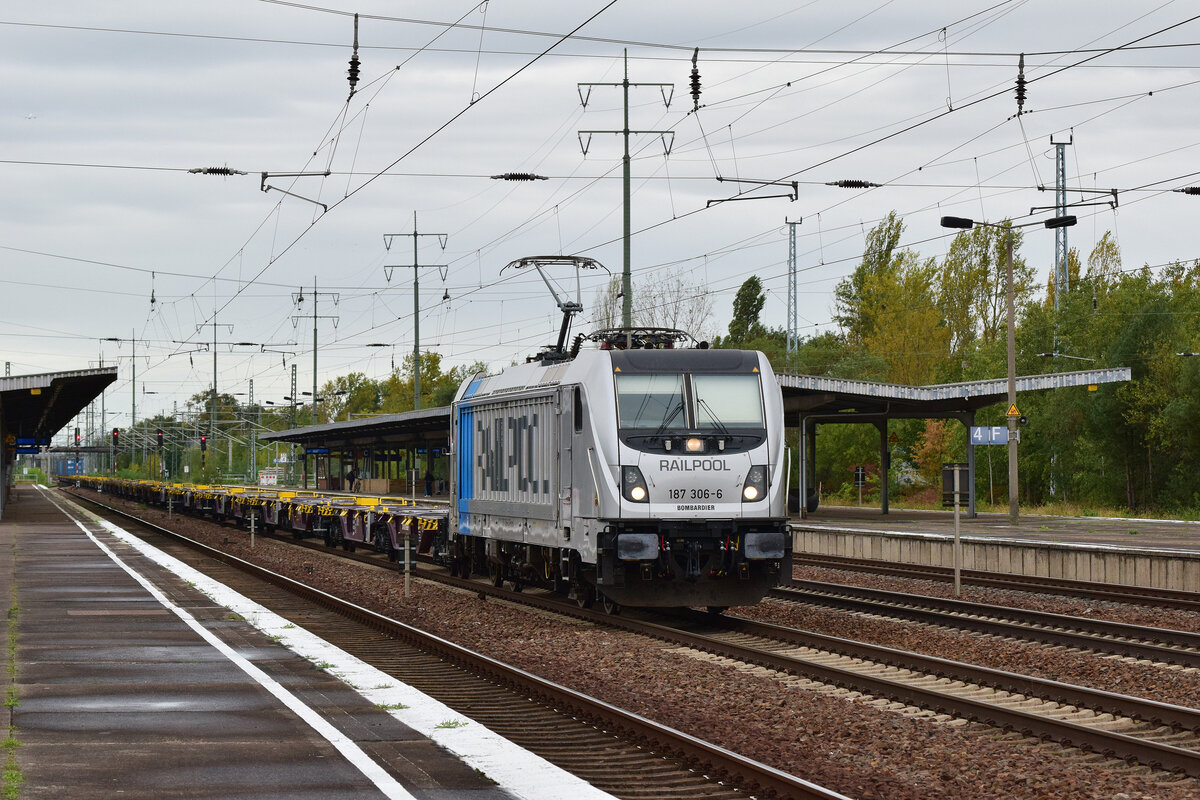 Bei der BLS kommen nicht nur immer mehr Vectron im Dienst und verdrängen ältere Loks, auch gemietete Loks sind auffällig, hier die 187 008 (Baujahr 2015) von Railpool mit den Aufschriften der BLS. Spiez, 14.Juni 2021