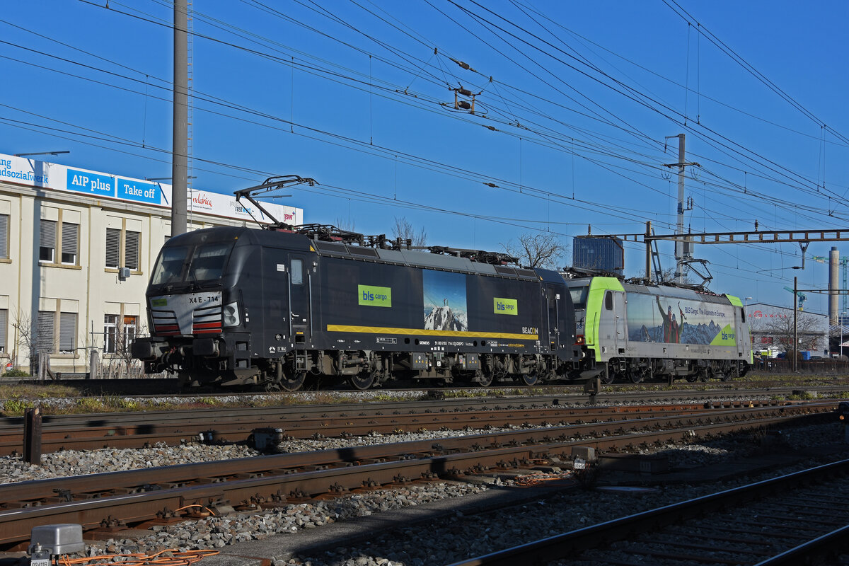 Doppeltraktion, mit den Loks 193 714-3 und 486 503-6 wird am 05.02.2026 in der Abstellanlage  beim Bahnhof Pratteln abgestellt..